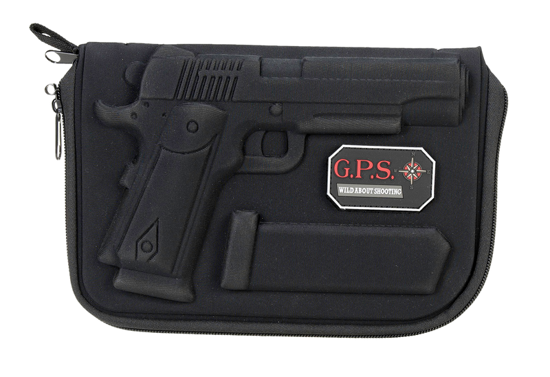 Custom compression-molded pistol case designed for 1911 and similar clones. Features double locking zippers for secure legal transport, internal magazine holder, oil-resistant moldable case lining, and compact dimensions of 10.6" x 7.6" x 1.6". Holds one handgun and one extra magazine.