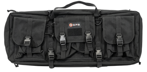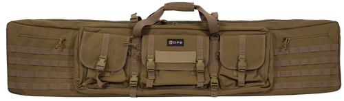 This double rifle case accommodates two rifles with main padded slots, a full-length padded divider, and hook & loop lockdown straps. It features two padded external pistol sleeves, three exterior accessory pockets, adjustable padded backpack straps, and MOLLE-compatible webbing. The case is constructed with 600D polyester exterior and interior shell with lockable zippers.
