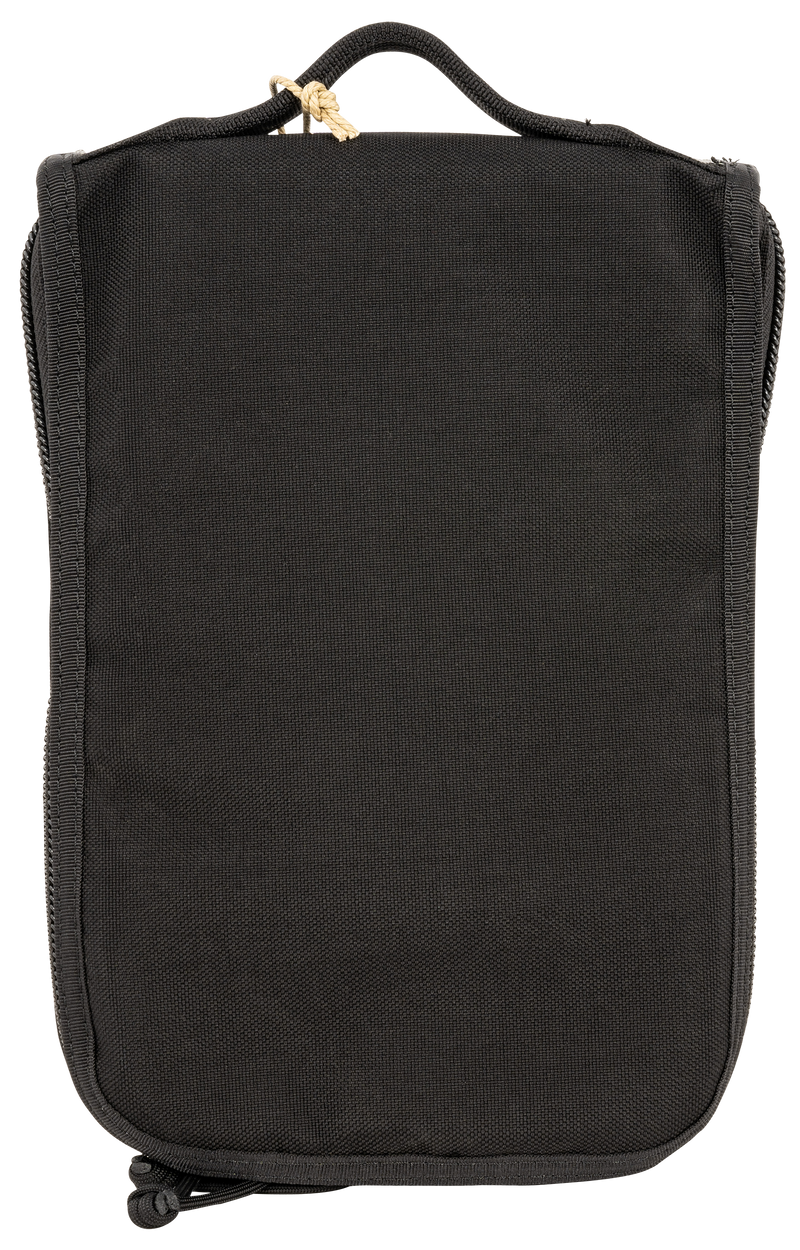 This tactical pistol case is constructed with heavy-duty 1000D polyester material and DuPont Teflon coating for durability. It accommodates a medium frame pistol and features four magazine storage pockets with lockable YKK zippers for secure legal transport. The case is designed to fit tactical range backpacks and measures 12.6" x 8.8" x 3.1".