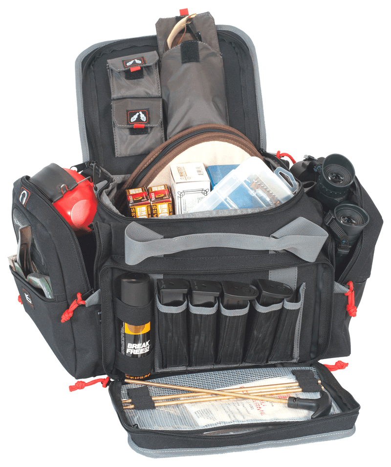 This medium-sized nylon range bag is designed for handgun and long gun shooters, featuring padded walls and bottom for firearm and ammunition protection. The bag includes a Visual I.D. Storage System for quick access to shooting glasses, ear protection, magazines, and other accessories, plus lift ports on each end for two-handed carrying and 2 ammo dump cups.