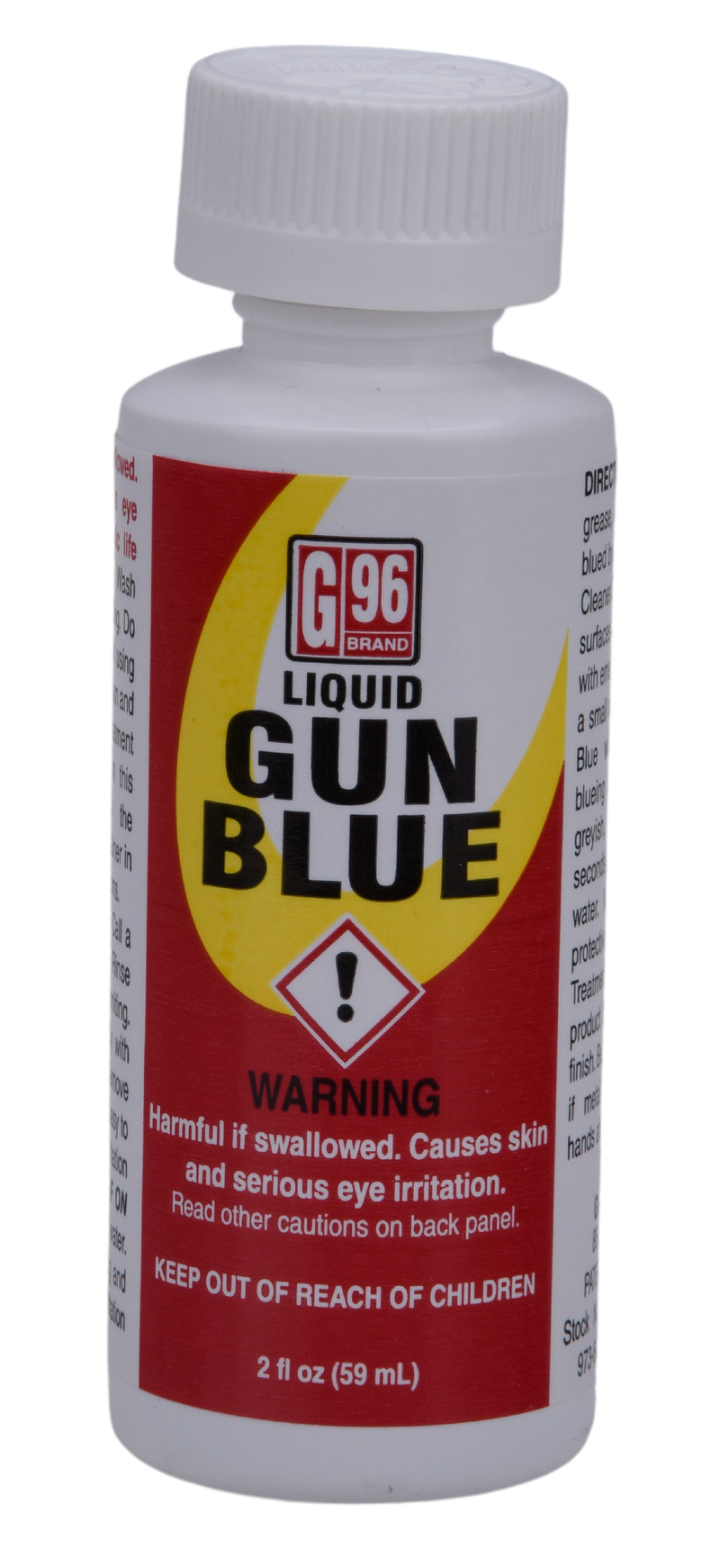 G96 Liquid Gun Blue is an instant-acting blueing solution designed for touch-up re-bluing of firearm surfaces. The liquid formula produces a rich, durable bluing finish that will not rub off or discolor. Surface preparation with degreaser and light sanding is recommended before application, with results typically visible within 15-30 seconds.