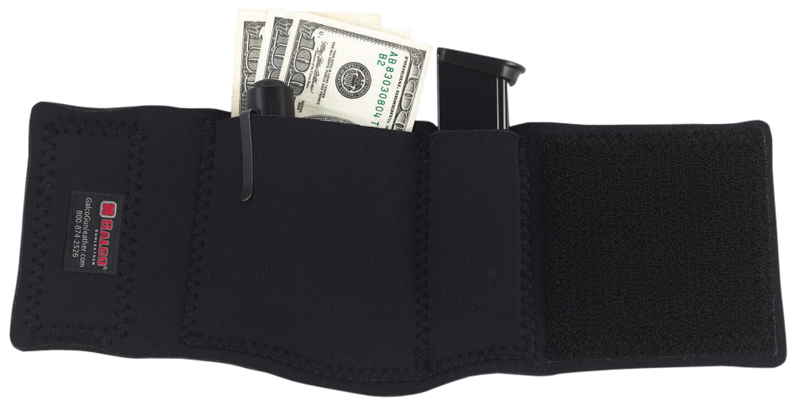 The Galco CAS Ankle Safe is a neoprene ankle holster designed to carry Springfield SA-35 handguns securely with a hook and loop mount system. Featuring two compartments, it accommodates clips, cuffs, and loaders alongside the primary firearm storage. The smooth neoprene construction measures 13" overall with precise dimensions of 8.3" length, 5.6" width, and 1.8" height for discrete ankle carry.