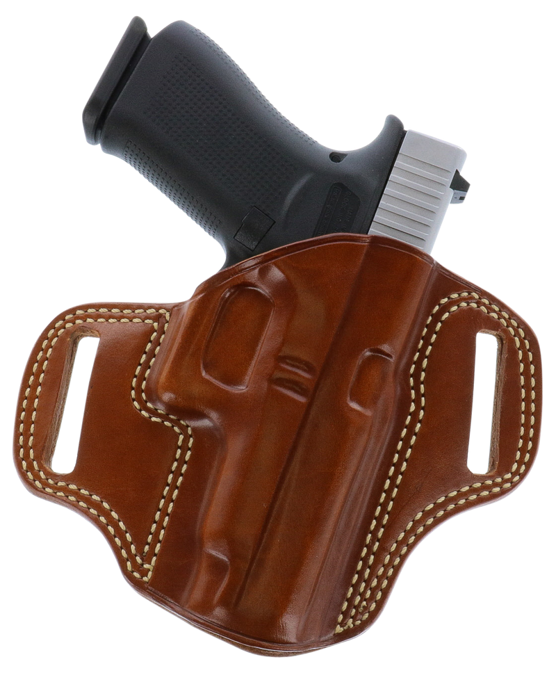 The Galco CM226 Combat Master is an outside-the-waistband (OWB) belt slide holster constructed from smooth tan leather, designed for right-hand carry. It is compatible with Glock 19, Glock 23 (Gen 2-5), and CZ P-10C pistols, and features a 1.75" wide belt loop for secure mounting on standard belts.