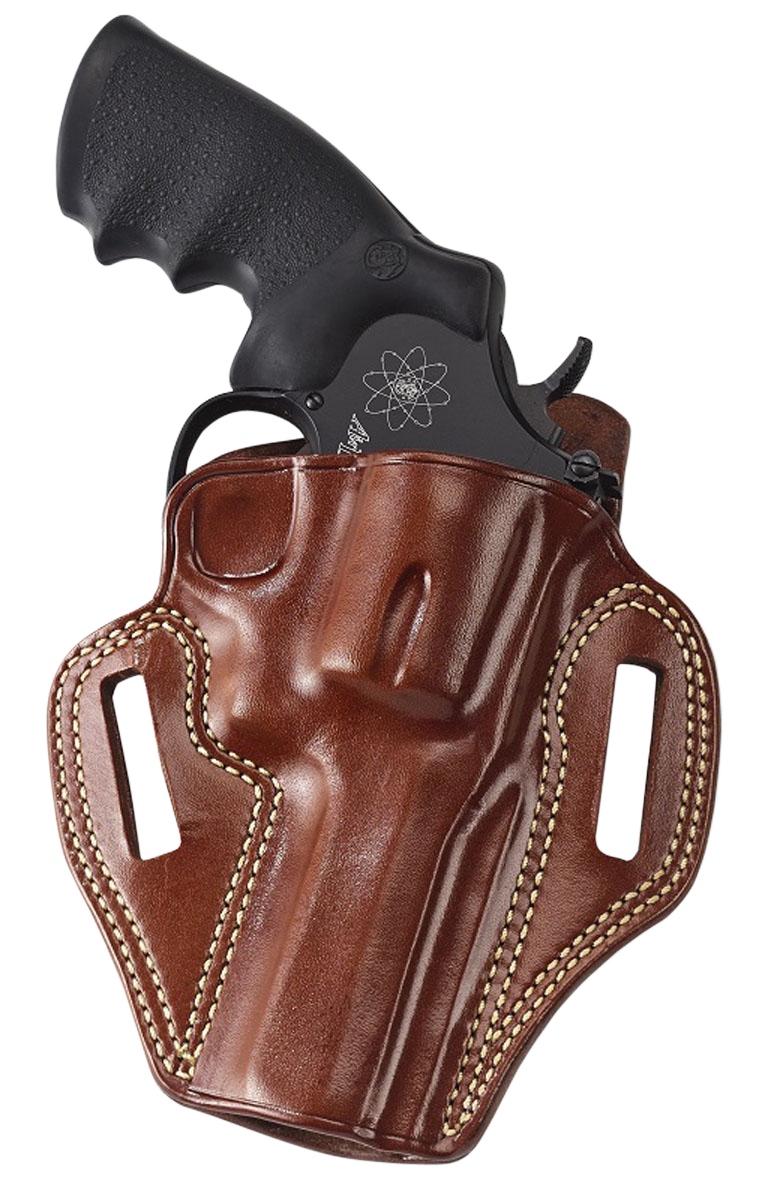 The Combat Master is a professional-grade, hand-molded belt holster designed for 1911 pistols with a 4.25" barrel. Features a high-riding pancake-style design with belt slots on either side to provide excellent retention and close body positioning. Made from tan leather with right-hand draw orientation.
