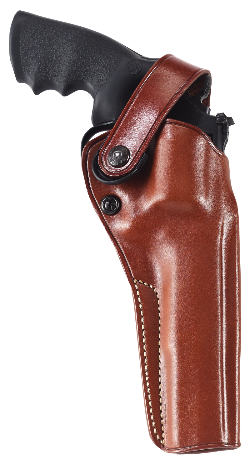 The Dual Action Outdoorsman (DAO) is a premium leather belt holster designed for S&W N Frame revolvers with up to 6" barrels, offering versatile strongside or crossdraw carry options. Features a retention strap with polymer tab for secure, gloved-hand operation, and tension screw adjustments for custom fit. Constructed from premium saddle leather, it is suitable for field carry in hunting or wilderness applications.