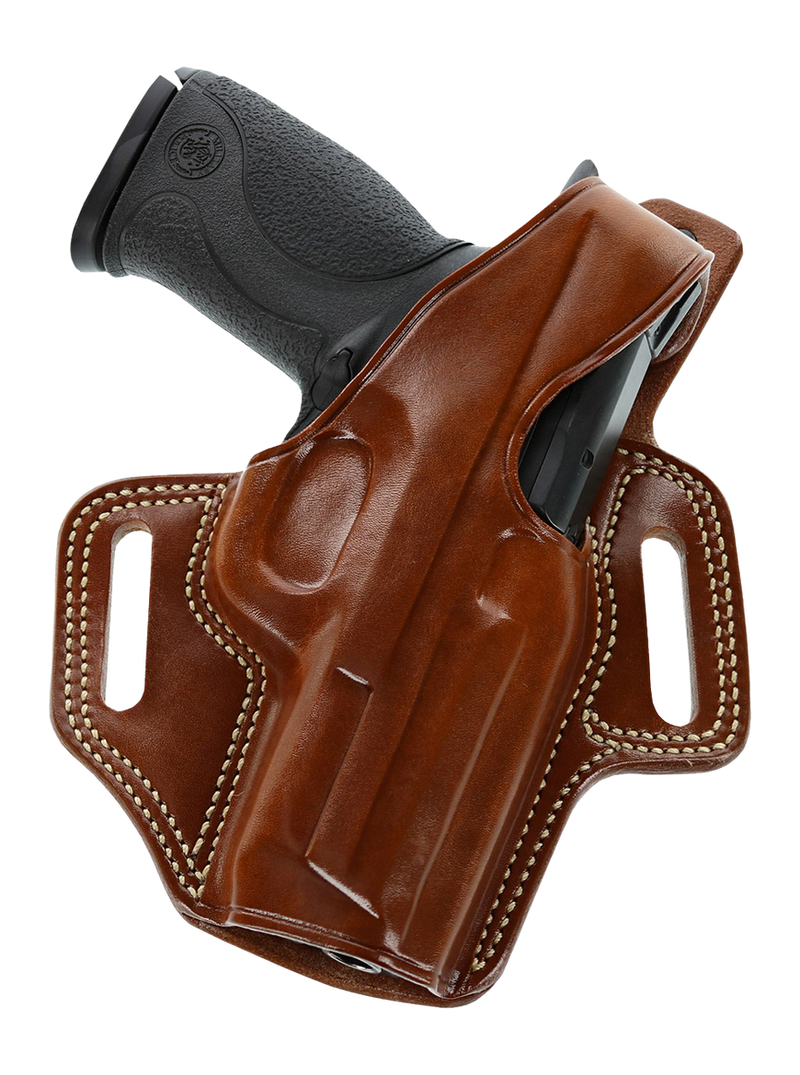 The Galco Fletch Auto is a retention holster designed for Glock 19, 19X, and 23 pistols. It features an automatic locking mechanism for secure weapon retention. The holster is constructed in tan leather for durability and classic styling.