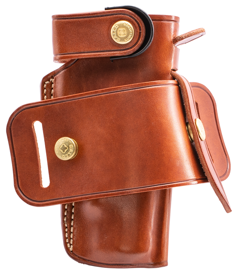 The Galco Ironhide is an outside-the-waistband (OWB) belt slide holster crafted from tan leather, designed to fit 1911 pistols and suitable for both left and right-handed shooters. This ambidextrous holster features a belt slide mount system with dimensions of 11.4" L x 7.5" W x 2.3" H, providing secure retention and comfortable all-day carry. The single-compartment design and quality leather construction make it a reliable choice for open carry or duty applications.