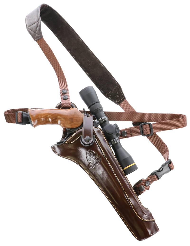 This leather shoulder holster system is designed for large-frame revolvers, specifically fitting S&W N Frame and Ruger Blackhawk models with 7.50" barrels. The Havana Brown leather construction features a torso strap mounting system for secure positioning during hunting or outdoor activities. Dimensions are 14.9" L x 7.0" W x 2.2" H with a single compartment design.