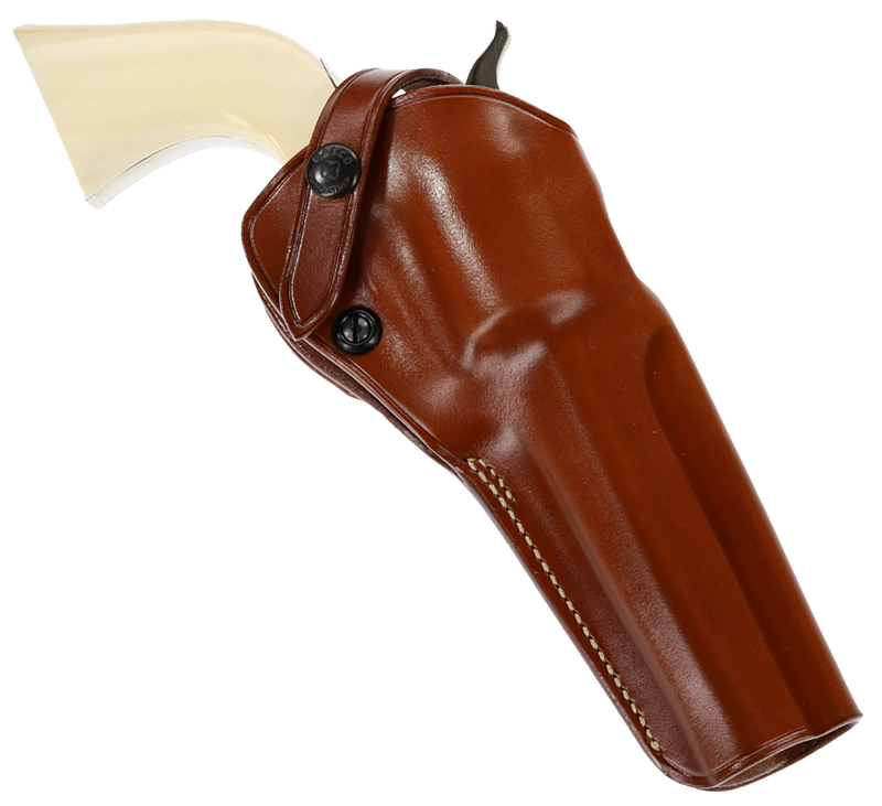 This Galco SAO142 is an outside-the-waistband (OWB) belt slide holster crafted from tan leather, designed to carry revolvers. It fits Ruger Blackhawk, Ruger Super Blackhawk, Ruger New Vaquero, and Colt SAA 4.75" models, and features a right-hand draw configuration. The holster measures 12.1" in length with a 6.2" width and 2.8" height, offering a secure carry option for single-action revolvers.