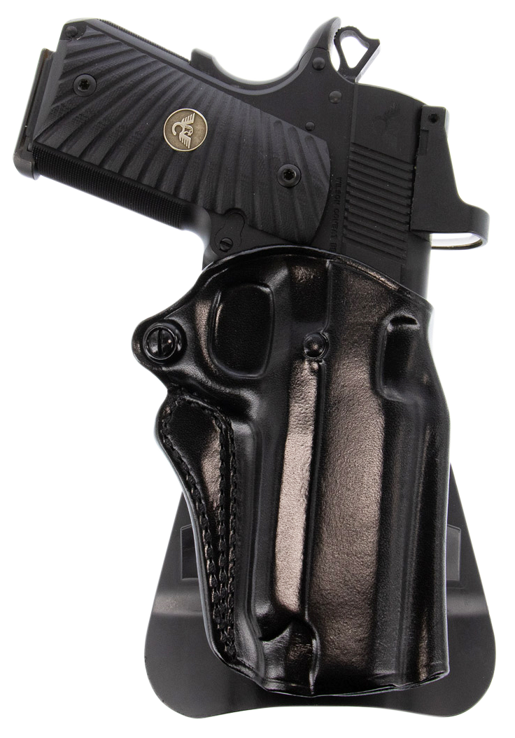 The Galco Speed Master 2.0 is an outside-the-waistband paddle holster constructed from black leather, designed for 1911 pistols with 5" barrels. This right-hand draw holster combines traditional leather craftsmanship with a secure paddle mounting system for everyday carry and range use.