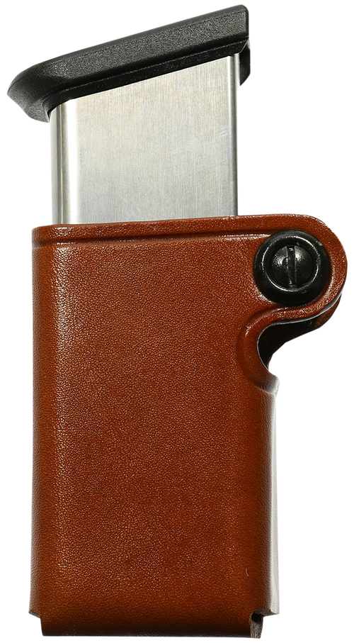 Single-compartment magazine pouch designed to hold 10mm/45 ACP single column metal magazines or cuffs. Features tan leather construction with a belt loop mount compatible with 1.75" wide belts and ambidextrous hand configuration. Dimensions: 9.9" L x 4.9" W x 1.9" H with smooth leather finish.