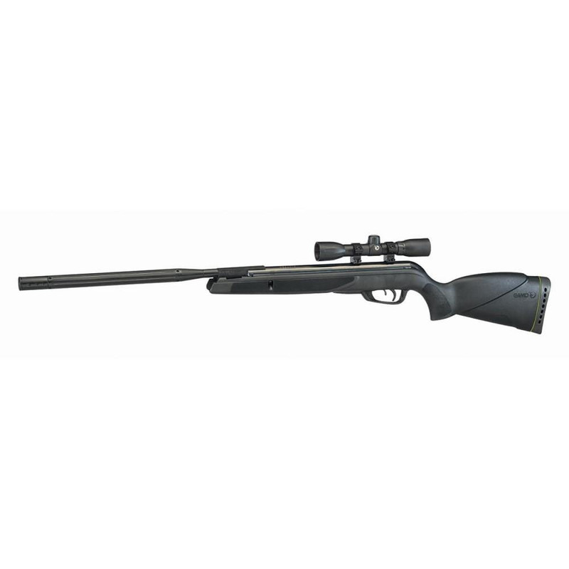 Gas piston air rifle chambered in .22 pellet with 19.1" rifled steel barrel and IGT Inert Gas Technology. Features Whisper noise dampening technology, included 4x32 scope, 2-stage adjustable trigger, and synthetic all-weather stock. Delivers 975-1000 fps with 178 ft-lbs of energy and weighs 5.64 lbs.