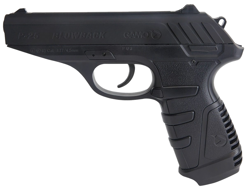 The Gamo P-25 Blowback is a CO2-powered air pistol chambered in .177 caliber with a double-action/single-action trigger and fixed front and rear sights. It features a 16+1 round capacity with black textured polymer grips and weighs 1.50 lbs. This compact blowback-action pistol measures 11.0 inches in length and is suitable for target shooting and small game.