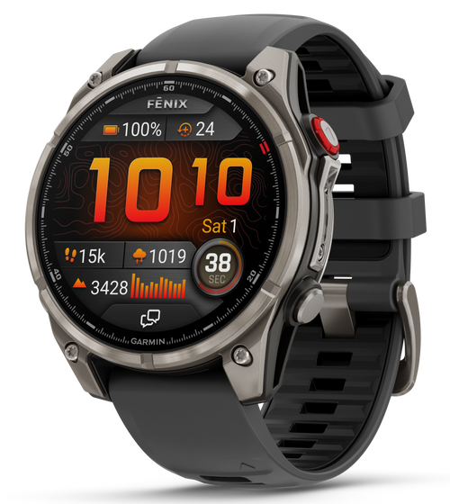 The Garmin Fenix 8 is a multisport smartwatch featuring a 47mm AMOLED display with 1.4-inch screen resolution and titanium bezel construction. This outdoor-focused watch offers GPS navigation, fitness tracking, and tactical features including maps and training metrics. The orange and titanium color scheme provides durability and visibility for hunting, tactical, and outdoor activities.