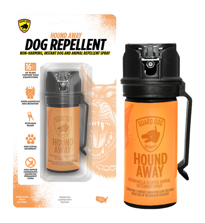 Dog spray deterrent designed for personal protection against aggressive animals. This 2-ounce canister provides a portable defense option for outdoor activities and personal safety situations.