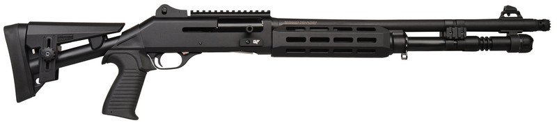 The Gforce Arms GF4 is a 12 gauge semi-auto shotgun with an 18.5" barrel and 5+1 capacity, featuring inertia-driven operation and Benelli Crio choke threads. It includes ghost ring iron sights, M-LOK forearm, and a Picatinny rail for customization. With a synthetic tactical stock and aluminum alloy receiver, this firearm weighs 7 lbs and has an overall length of 39.75", chambered for both 2.75" and 3" shells.