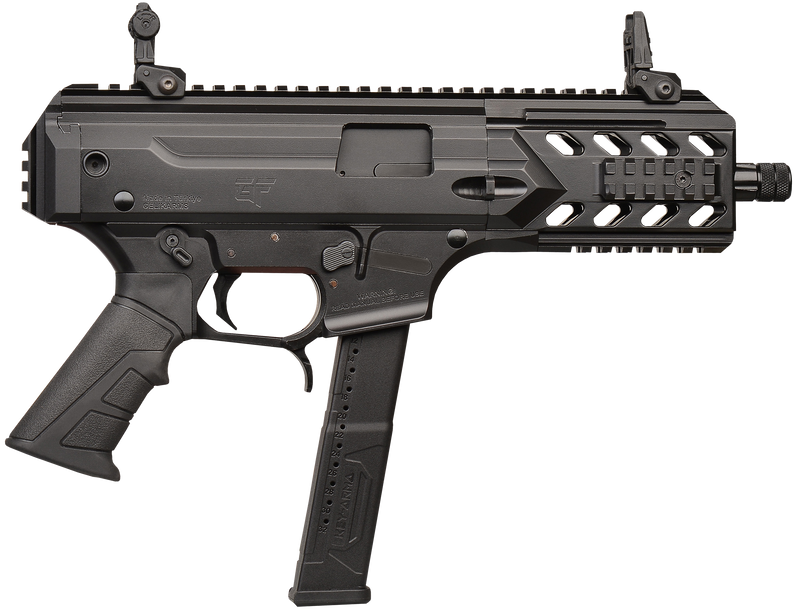 The Gforce Arms Blade6 is a semi-auto pistol chambered in 9mm Luger with a 6" QPQ steel barrel and 33+1 round capacity. Features include a black anodized aluminum receiver, flip-up polymer sights, Picatinny rail for optics, rear Picatinny rail brace mount, and Glock magazine compatibility. Weighs 5.7 lbs with an overall length of 15" and muzzle threads of 1/2x28 UNEF.
