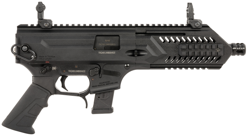 The Gforce Arms Blade 8 is a semi-automatic pistol chambered in 9mm Luger with an 8" QPQ steel barrel and 15-round capacity. It features a black Cerakote aluminum receiver with Picatinny rail, ambidextrous safety, adjustable flip-up sights, and is compatible with Glock-pattern magazines. The pistol weighs 6.2 lbs with an overall length of 17".