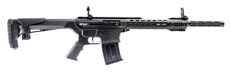 The Gforce Arms GF25 is a 12 gauge semi-automatic shotgun chambered for 3" shells with a 5+1 capacity. It features an 18.5" spiral threaded barrel and aluminum receiver finished in Black Cerakote with a Picatinny rail, adjustable synthetic stock with rubber grip, and flip-up front and rear sights. The shotgun weighs 8 lbs and is compatible with MKA 1919 magazines and Benelli Mobil chokes.