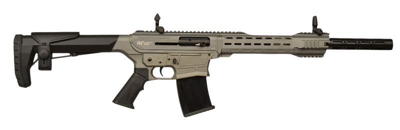 The Gforce Arms GF25 is a 12 gauge semi-automatic shotgun chambered for 3" shells with a 5+1 capacity and 18.5" spiral threaded barrel. The receiver and barrel are finished in Tungsten Cerakote with an adjustable black synthetic stock, flip-up front and rear sights, and QD sling attachments. It weighs 8 lbs and is compatible with MKA 1919 magazines.