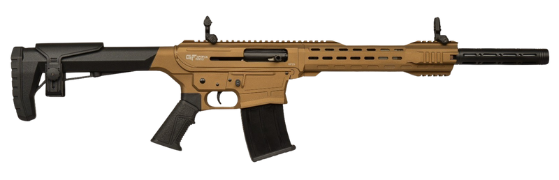 The Gforce Arms GF25 is a 12 gauge semi-automatic shotgun chambered for 3" shells with a 5+1 capacity and 18.5" spiral threaded barrel. The aluminum receiver and barrel are finished in Bronze Cerakote with a Picatinny rail, adjustable black synthetic stock, and flip-up front and rear sights. This tactical shotgun weighs 8 lbs and is compatible with MKA 1919 magazines.