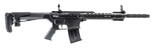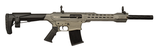 The Gforce Arms GF25 is a 12 gauge semi-automatic shotgun chambered for 3" shells with a 5+1 capacity and 18.5" threaded barrel. The receiver and barrel are finished in Flat Dark Earth Cerakote with flip-up adjustable sights and a black synthetic tactical stock. It features MKA 1919 magazine compatibility, QD sling attachments, and a Picatinny rail for optics, weighing 8 lbs.