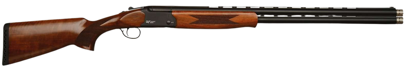 The GF5 is a break-action over/under shotgun chambered in .410 Bore with a 28-inch ventilated rib barrel and 2-round capacity. It features a black aluminum receiver, fixed Turkish walnut stock, fiber optic front sight, and includes 5 interchangeable choke tubes (Cylinder, Improved Cylinder, Modified, Improved Modified, Full). Weighing 5.8 lbs with a 45.5-inch overall length, this shotgun is well-suited for upland game hunting.