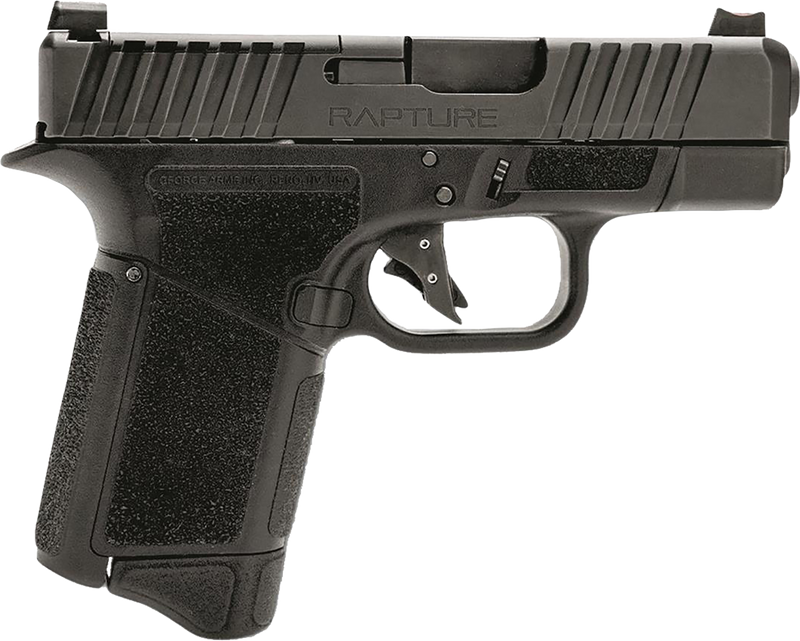 The Gforce Arms GF9 Rapture is a striker-fired semi-auto pistol chambered in 9mm Luger with a 3.25" barrel and 12+1 capacity. It features an optics-ready slide with RMR/RMSc footprint, front and rear slide serrations, fiber optic sights, and aggressive grip stippling. The sub-compact polymer frame weighs 1.4 lbs and includes four interchangeable grip backstraps.
