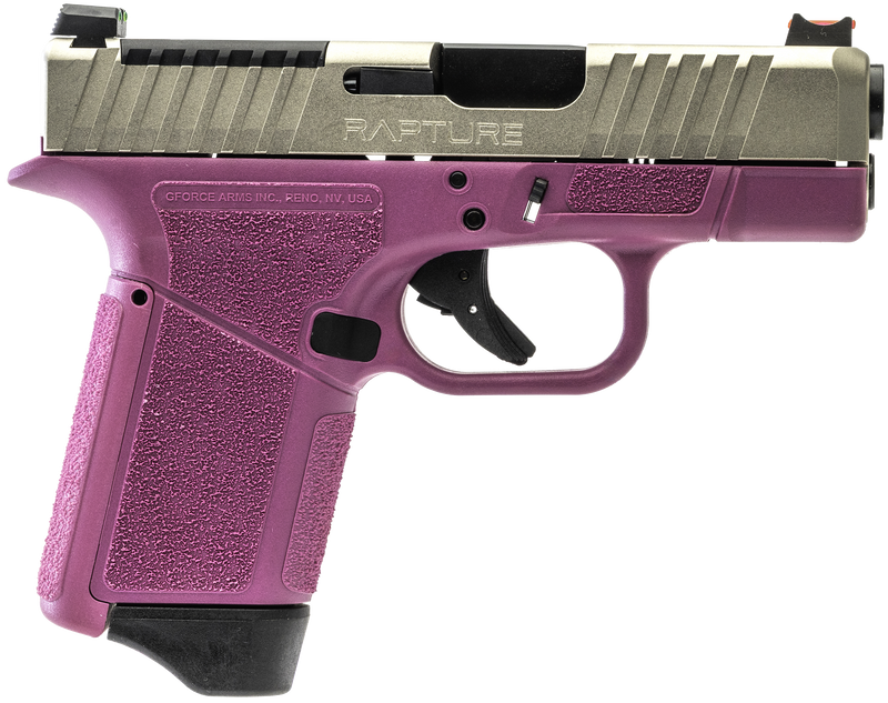 The Gforce Arms GF9 Rapture is a striker-fired semi-automatic sub-compact pistol chambered in 9mm Luger with a 3.25" barrel and 12+1 capacity. It features an optics-ready slide with RMR/RMSc footprint, front and rear serrations, fiber optic sights, and aggressive stippling on the polymer frame. The gun weighs 1.4 lbs and includes four grip backstraps for fit customization.