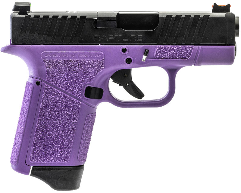 The Gforce Arms GF9 Rapture is a striker-fired, semi-automatic sub-compact pistol chambered in 9mm Luger with a 3.25" barrel and 12+1 capacity. It features an optic-ready slide with RMR/RMSc footprint, fiber optic front and rear sights, front and rear slide serrations, and a purple cerakote polymer frame with aggressive stippling and interchangeable grip backstraps. The pistol weighs 1.4 lbs and is compatible with Glock 26 magazines.