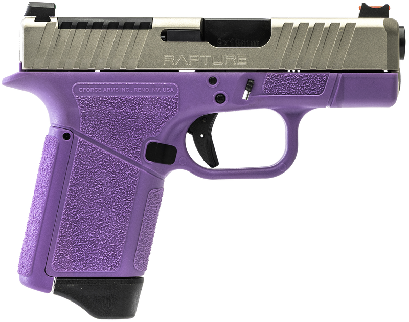 The Gforce Arms GF9 Rapture is a striker-fired, semi-automatic sub-compact pistol chambered in 9mm Luger with a 3.25" barrel and 12+1 round capacity. Features include an optics-ready slide with RMR/RMSc footprint, front and rear serrations, fiber optic sights, aggressive grip stippling, and a purple polymer frame with nickel steel slide. Includes four grip backstraps and is Glock 26 compatible.
