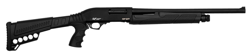 The Gforce Arms GF2P is a 12 gauge pump action shotgun featuring a 20" barrel with a fixed cylinder bore choke and 7+1 capacity. It includes a picatinny rail for optics mounting, fixed blade front sight, and a black synthetic stock with integrated 5-shell carrier. This tactical shotgun weighs 7 lbs and has a 3" chamber, suitable for various shotgun applications.
