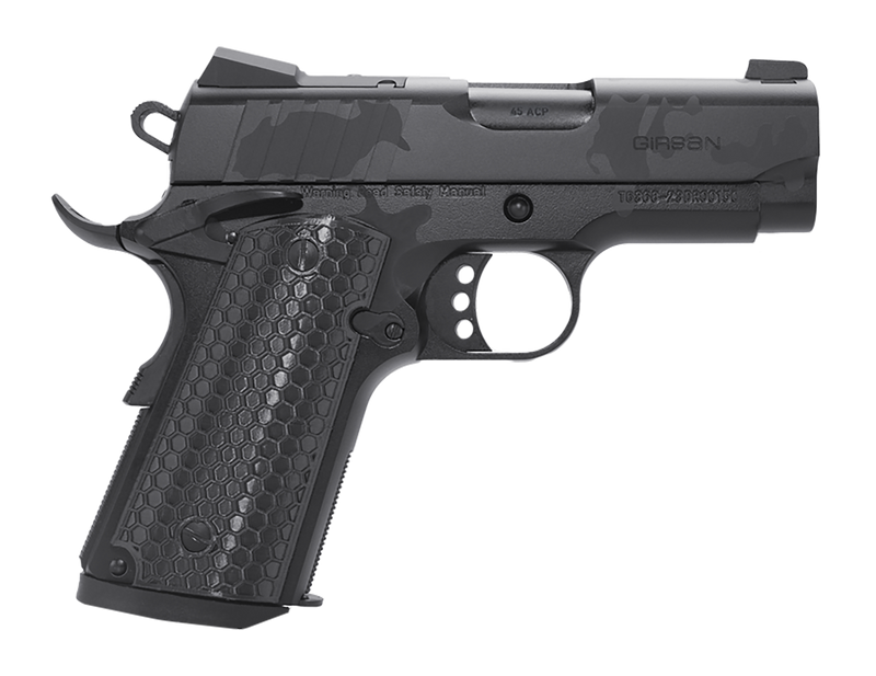 The Girsan MC1911 SC Influencer is a sub-compact 1911-style pistol chambered in 45 ACP with a 3.4" barrel and single-action trigger. Features an optic-ready, serrated steel slide, ambidextrous safety, Picatinny rail, beavertail grip safety, and black polymer grips. Dimensions: 11.6"L x 3.0"H x 8.6"W.