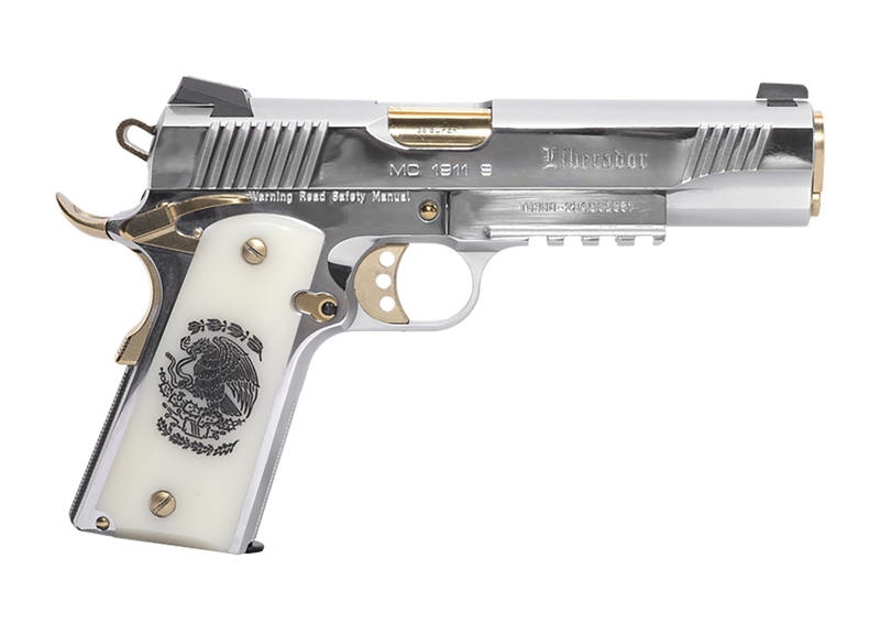 Semi-automatic 1911-style pistol chambered in 38 Super with a 5" barrel and 9+1 round capacity. Features a polished chrome finish, ambidextrous safety, extended beavertail, accessory rail, and engraved Mexican Coat of Arms grips. Full-size steel frame with fixed Novak-cut rear sight and fixed front sight.