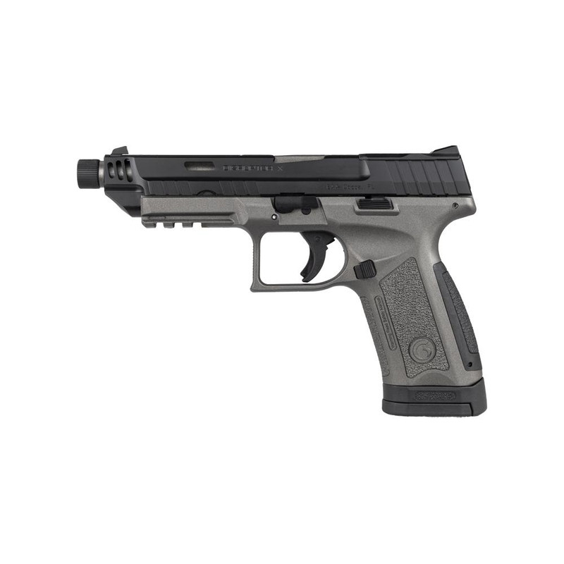 The Girsan MC9 Disruptor X is a striker-fired semi-automatic 9mm pistol with a 4.6" threaded barrel and 17+1 round capacity. Features include an optics-ready slide with RMS/RMSc footprint, tactical lightening cuts, low-profile fixed sights, polymer frame with tungsten gray and black cerakote finish, and three interchangeable backstraps. This full-size handgun weighs 22.4 oz and measures 7.9" overall, offering reliability and accuracy in a suppressor-ready platform.