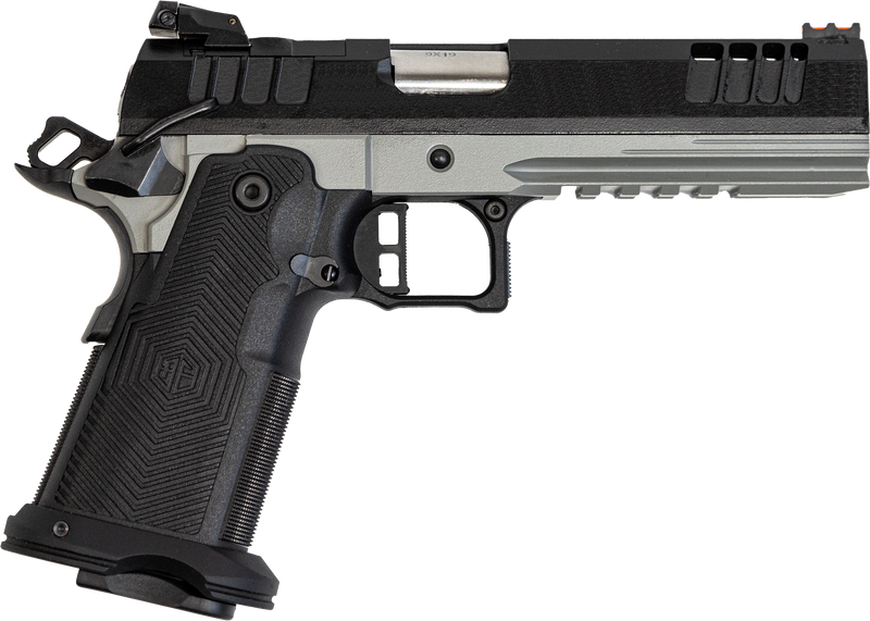 The Great Lakes Firearms 1911DS Synergy is a 9mm semi-automatic pistol featuring a 5" barrel with an optic-ready cut and serrated slide. This double-stack 1911 includes a black Cerakote finish, bull shark polymer grip frame, ambidextrous safety, fiber optic iron sights, and comes with two 20-round magazines for a 20+1 capacity.