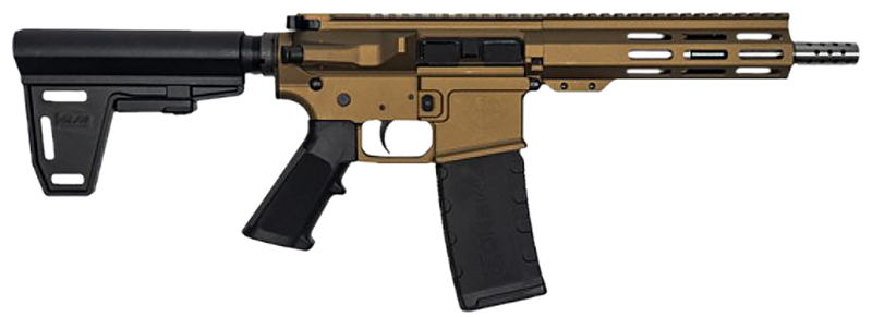 Semi-automatic AR-15 pistol chambered in .223 Wylde with a 7.5" stainless steel barrel featuring a 1:8 twist rate and 1/2x28 threaded muzzle. Includes a pistol brace, 30-round magazine capacity, mil-spec trigger and controls, and a 15.25" M-LOK handguard with full top Picatinny rail. Bronze Cerakote finish on 7075 billet aluminum lower receiver; weighs approximately 5 lbs and measures 23.5" overall length.