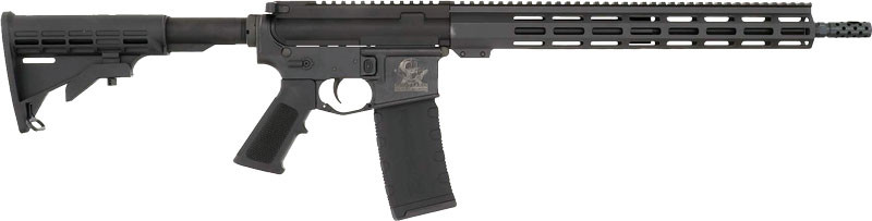Semi-automatic AR15-pattern rifle chambered in .223 Wylde (compatible with .223 Rem and 5.56 NATO) with a 16-inch heavy barrel and carbine gas system. Features a full-length Picatinny rail handguard, ambidextrous controls, aluminum receiver, and includes one 30-round magazine and muzzle brake.