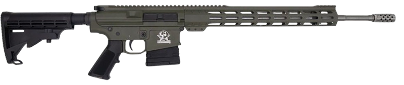 Semi-automatic AR-10 platform rifle chambered in 6.5 Creedmoor with a 20" stainless steel barrel featuring 5R rifling and 1:8 twist rate. Built on 7075 billet aluminum receivers with Cerakote OD Green finish, threaded muzzle brake, adjustable Mil-Spec stock, and 15.125" M-LOK rail system. Weighs 8.6 lbs and includes one 10-round magazine.