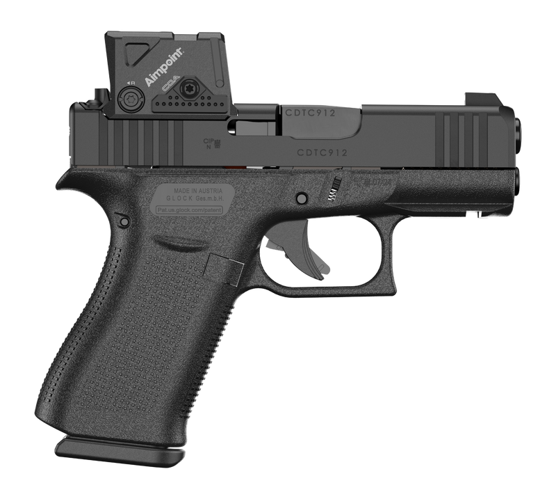 The Glock 43X MOS is a striker-fired, semi-automatic sub-compact pistol chambered in 9mm with a 3.41" Glock Marksman Barrel and nDLC finish. It features an optics-ready Modular Optics System (MOS8) slide and comes with fixed sights, a 15-round magazine capacity, and an included Aimpoint COA optic. This polymer-framed handgun is designed for concealed carry with modern optics compatibility.