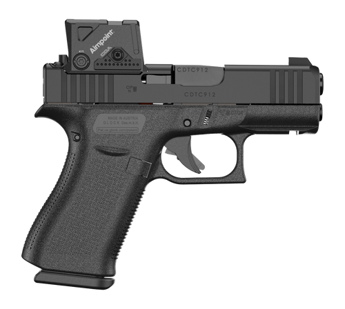 The Glock 43X MOS is a 9mm striker-fired compact pistol with a 3.41" barrel and 10-round capacity. It features a modular optics system (MOS8) pre-cut for Aimpoint COA optic mounting, polymer frame with front rail, and fixed sights. Ships with 2 magazines and weighs 18.6 oz.