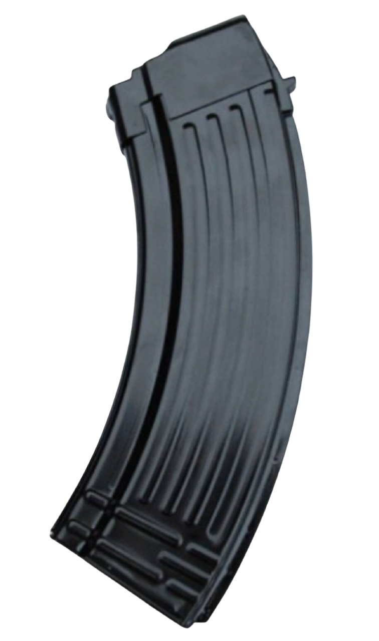 This is a 30-round steel magazine chambered in 7.62x39mm, designed to fit AK-47 pattern rifles. The magazine features fully ribbed construction for added strength and durability, making it suitable for long-term storage and reliable field use.