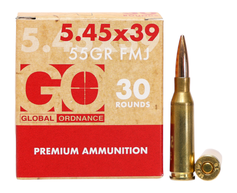 Global Ordnance 5.45x39mm centerfire rifle ammunition loaded with 55 grain full metal jacket projectiles. Factory new brass case ammunition manufactured to C.I.P. standards in the Czech Republic, delivering 2854 fps muzzle velocity and 995 ft-lbs of energy.