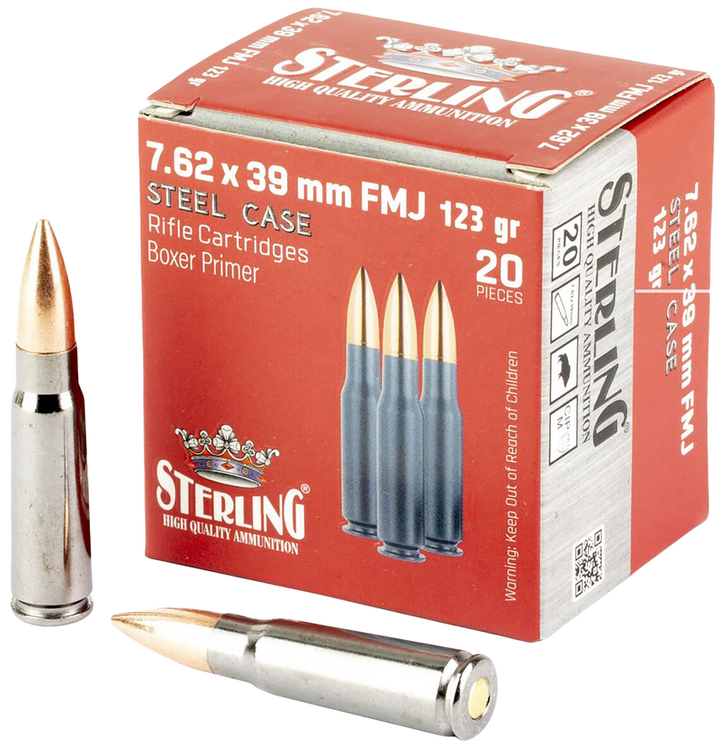 Sterling Steel Case Select 7.62x39mm rifle ammunition loaded with 123-grain full metal jacket bullets in steel cases with Boxer primers. This ammunition produces a muzzle velocity of 2362 fps and comes in 20-round boxes, with 50 boxes per case for bulk shooters.