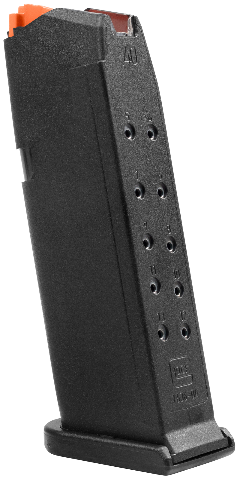 OEM Glock magazine chambered in .40 S&W with 13-round capacity, designed for Glock 23 Gen5 pistols. Features black polymer construction with orange follower and complies with 13-round magazine capacity restrictions in regulated states. This factory original magazine is suitable for training, range practice, and personal defense applications.