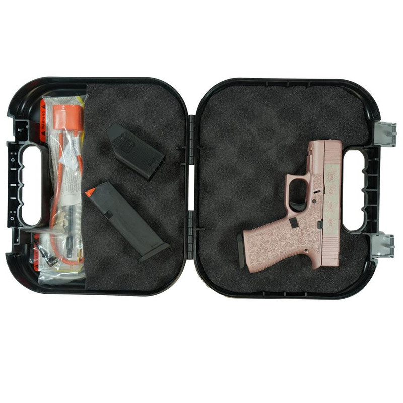 Semi-auto striker-fired handgun chambered in 9mm Luger with a 3.41" barrel and 10-round capacity. Features a custom "Glock & Roses" design with rose gold and silver finishes, RMR/c optic cut, accessory rail, and includes two magazines.