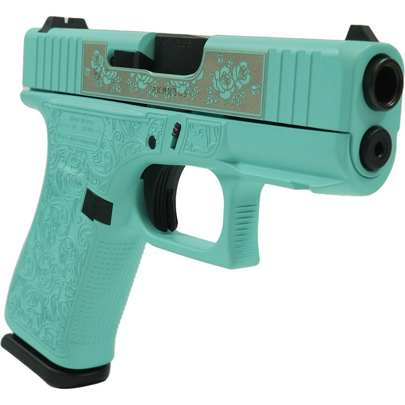 Semi-automatic striker-fired pistol chambered in 9mm Luger with a 3.41" barrel and 10-round capacity. Features custom "Glock & Roses" design with robin's egg blue and silver Cerakote finish on the slide and engraved grip, plus an accessory rail for mounting lights or lasers.