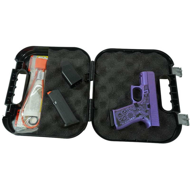 Semi-auto striker-fired pistol chambered in 9mm Luger with a 3.41" barrel and 10-round capacity. Features custom purple pearl cerakote finish with mandala engraving on the grip, accessory rail, and includes two magazines.