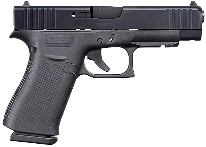 The Glock 48 Gen5 is a striker-fired semi-automatic pistol chambered in 9mm Luger with a 4.17" Glock Marksman Barrel and nDLC-finished serrated slide. This slim compact features a polymer frame with beavertail, front accessory rail, fixed sights, and Glock's Safe Action System with three independent safeties. It includes two 10-round magazines and weighs 18.48 oz, designed for reliable everyday carry and made in the USA.