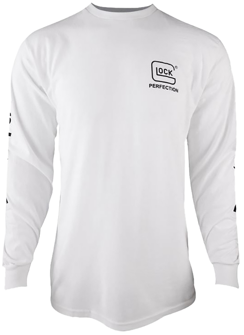 Glock branded long sleeve t-shirt featuring the "Perfection" model design. Made from pre-shrunk cotton for durability and minimal shrinkage after washing. Available in size Small with a classic white colorway.